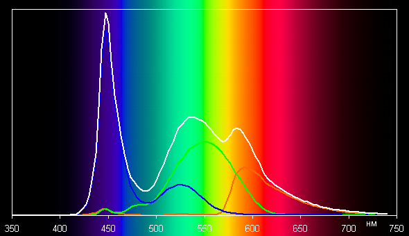 Такой спектр с относительно узким пиком синего и с широкими горбами зеленого и красного цветов характерен для экранов, в которых используется белая светодиодная подсветка с синим излучателем и желтым люминофором. Спектры показывают, что светофильтры матрицы значительно подмешивают компоненты друг к другу, что и сужает цветовой охват.