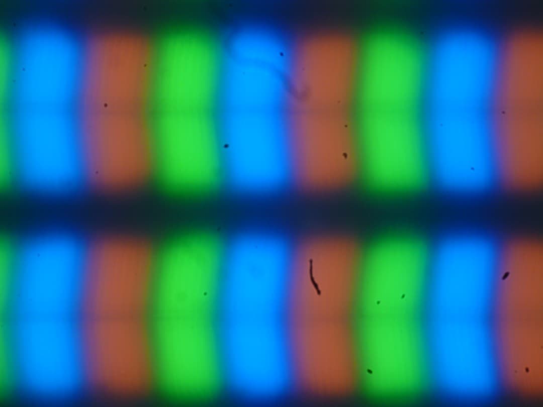 В этом экране используется матрица типа IPS. Микрофотографии демонстрируют типичную для IPS структуру субпикселей (черные точки — это пыль на матрице фотоаппарата):