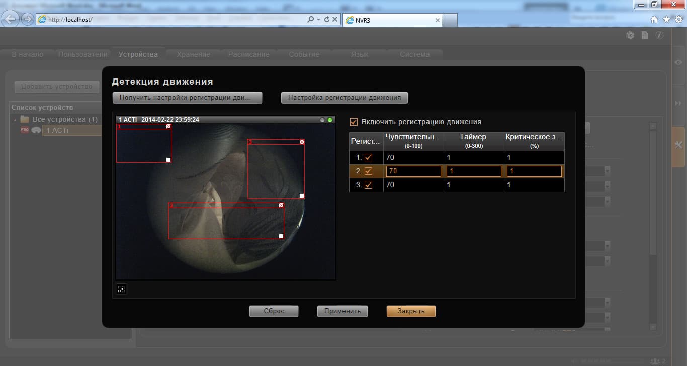 Настройка детекции (обнаружения) движения. Всего предусмотрено три зоны детекции движения произвольных размеров и положения. Возможна раздельная настройка чувствительности каждой зоны. После настроек предлагаем заглянуть в раздел изучения архивных записей: