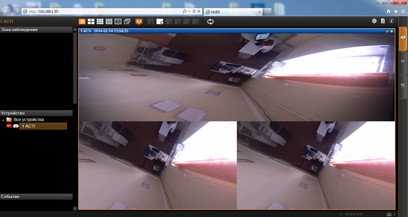 | В этом режиме ACTi E96 эмулирует сразу две IP-камеры | Полноценная работа этого режима возможна только при использовании «ACTi NVR Workstation». Здесь возможно PTZ-управление двумя нижними виртуальными камерами | Крайне интересный режим, в котором эмулируется наличие сразу четырех PTZ-камер. Учитывая очень широкий угол обзора реального объектива, четыре управляемые (пусть даже виртуально) камеры здесь просто необходимы |