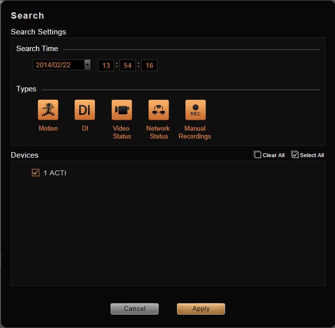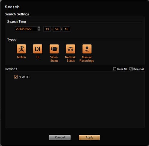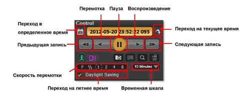 В левой части экрана мы видим уже знакомую нам панель с вкладками различных режимов работы. Но панель эта немного иная — на ней добавились вкладки найденных событий и управления просмотром архива. Вот так выглядит панель поиска: