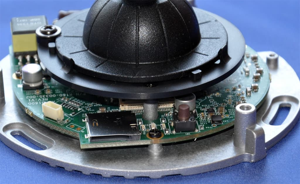 Обратите внимание на то, что монтажная плата закреплена на нижней части корпуса, которая выполнена из алюминия (еще раз вспомним про вандалоустойчивость). С этого угла хорошо различим разъем порта Ethernet, с помощью которого камера подключается к сети. Немного развернем камеру: