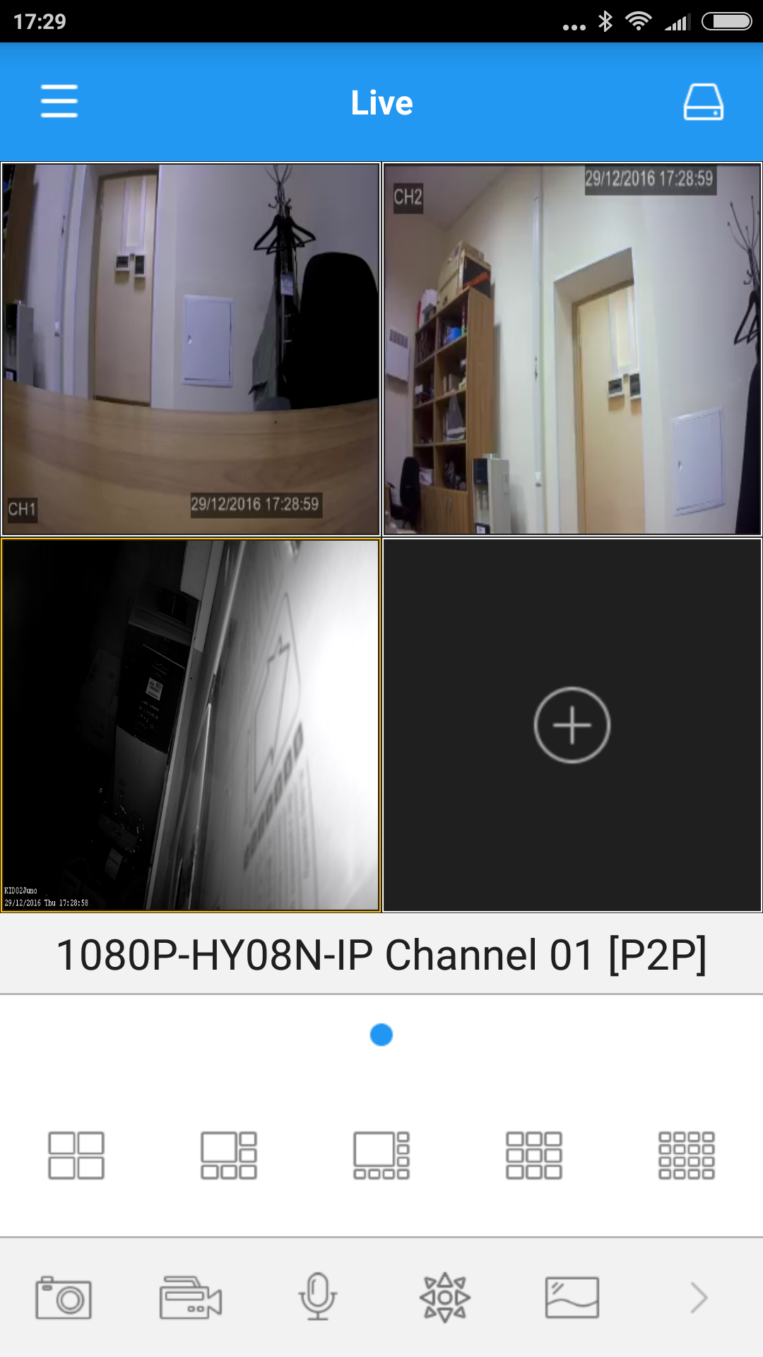 При наведении мышки на нижнюю часть окна или нажатии кнопки на пульте, показывается меню для перехода к настройкам, режиму просмотра, изменению сетки, включению последовательного переключения камер и с другими функциями.