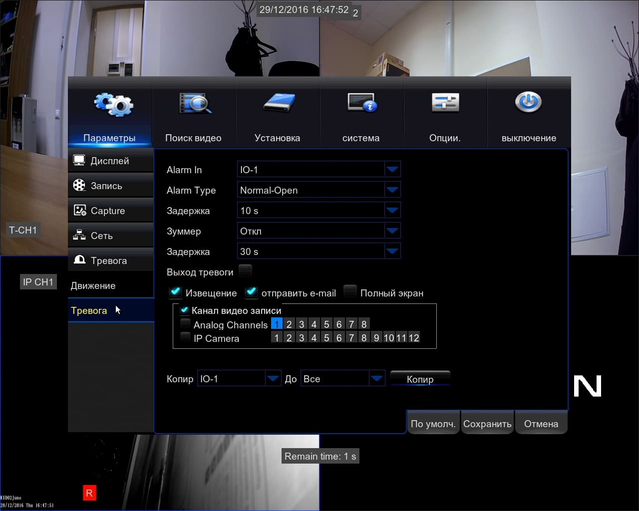 Для таких системных событий, как переполнение или ошибка диска, а также потеря сигнала (работает и с аналоговыми камерами и с IP-камерами) можно выбрать варианты сигнализации и их длительность.