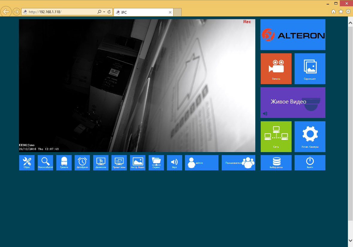 После этого вы обращаетесь к веб-интерфейсу видеорегистратора и видите на первой странице живую картинку с камер. Здесь также можно менять и настраивать сетку, выбирать камеры, подстраивать картинку, использовать PTZ.