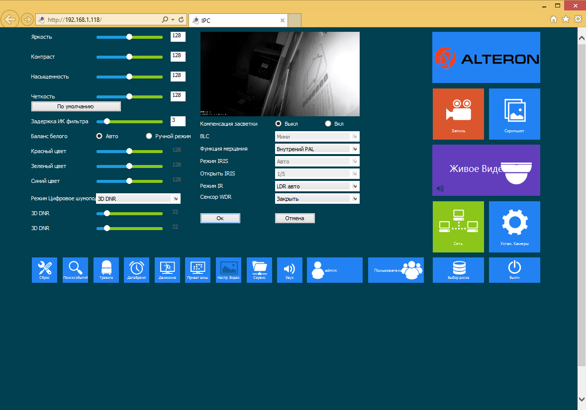 Меню камеры позволяет изменить многие параметры работы устройства, включая настройки изображения — экспозицию, баланс белого, цифровые фильтры, режим день/ночь, поворот/зеркало и другие.