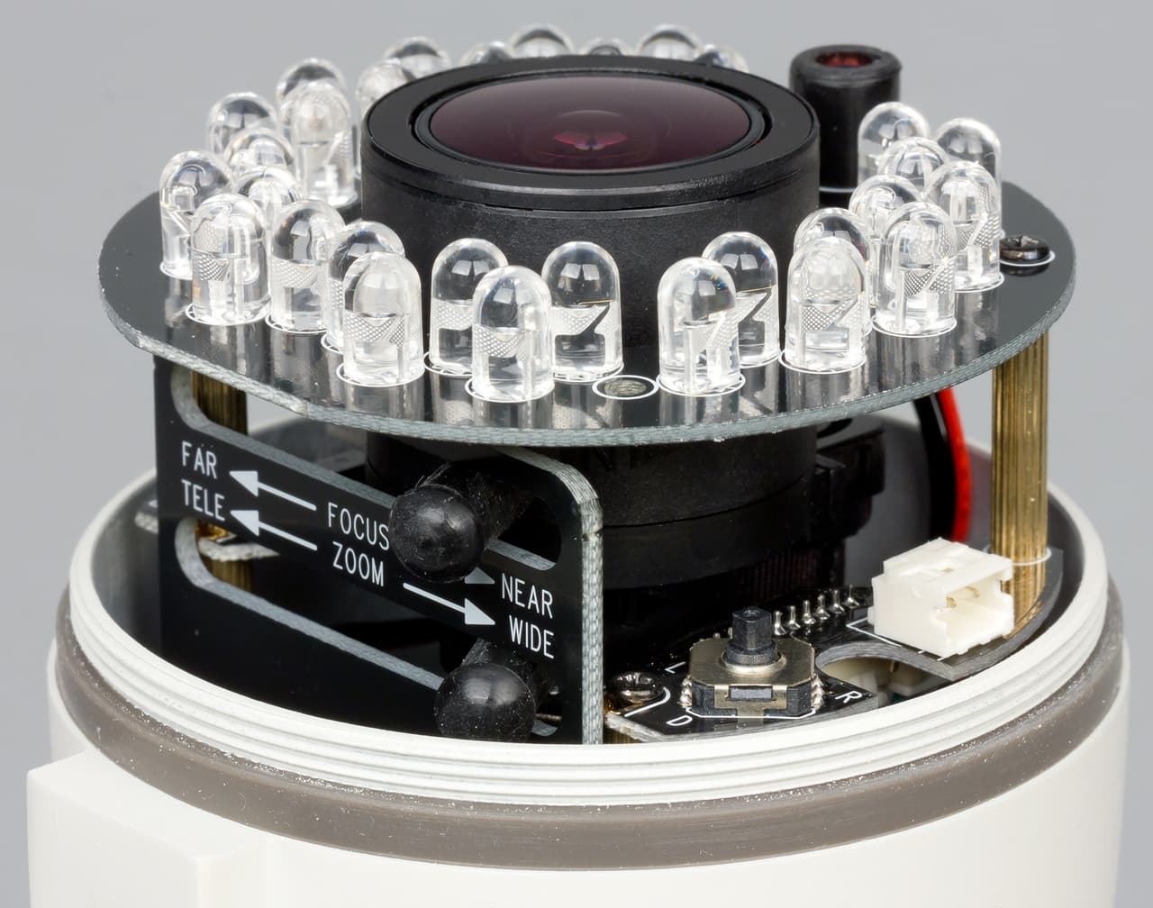 Для настройки объектива и изменения параметров камеры потребуется снять верхнюю часть корпуса. Под ней мы найдем две ручки для выбора увеличения и фокуса, порт для подключения видеовыхода для оперативной настройки положения камеры, а также миниджойстик для работы с меню устройства.