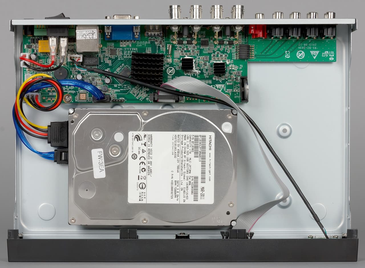 Для записи видеоинформации внутри корпуса есть место для установки одного жесткого диска. Какого-либо списка совместимости производитель не предлагает. Желательно использовать модели рассчитанные на работу в режиме 24/7, например, ориентированные специально на системы видеонаблюдения винчестеры. Но при желании можно установить и SSD. Есть возможность экспорта записей на USB-накопитель для резервного копирования. Сетевое подключение видеорегистратора обеспечивается встроенным гигабитным контроллером.