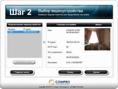 Работа iWizard, как во всех приложениях с подобной архитектурой, разбита на шаги. Сначала предлагается выбрать из списка нужную камеру, если в сети их несколько (но это не наш случай, в нашем списке имеется лишь одна камера). Если всё в порядке и камера активна, то в небольшом просмотровом окне пользователь увидит живую картинку с выбранной камеры.