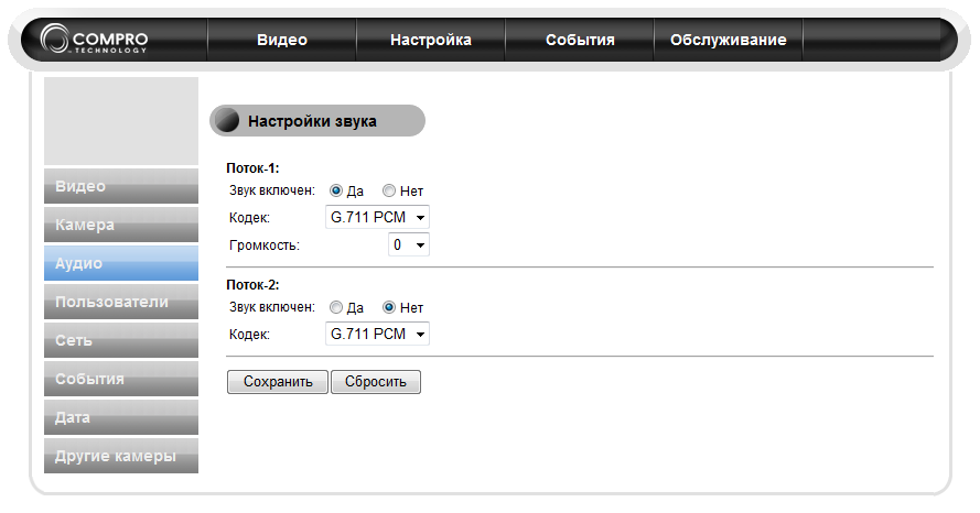 Сжатие | G.711 PCM 64 Кбит/с |