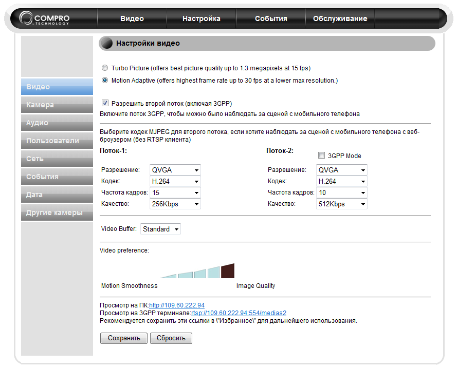 Режим 3GPP | прямое видео с камеры на экранах сотовых телефонов третьего поколения (поток 3GPP) |