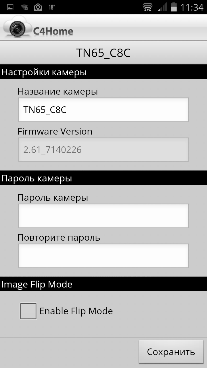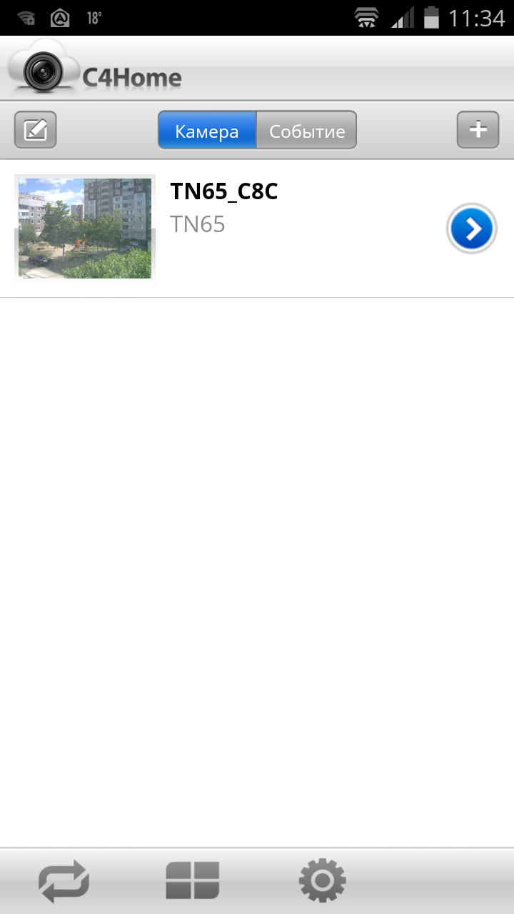 | Активная камера в списке учетной записи | Настройки реакции смартфона, активация сервиса Push-уведомлений о событиях | Имя камеры, пароль для входа, переворот картинки | Настройки видео- и аудиопотока, поступающего в облако и на мобильное устройство |