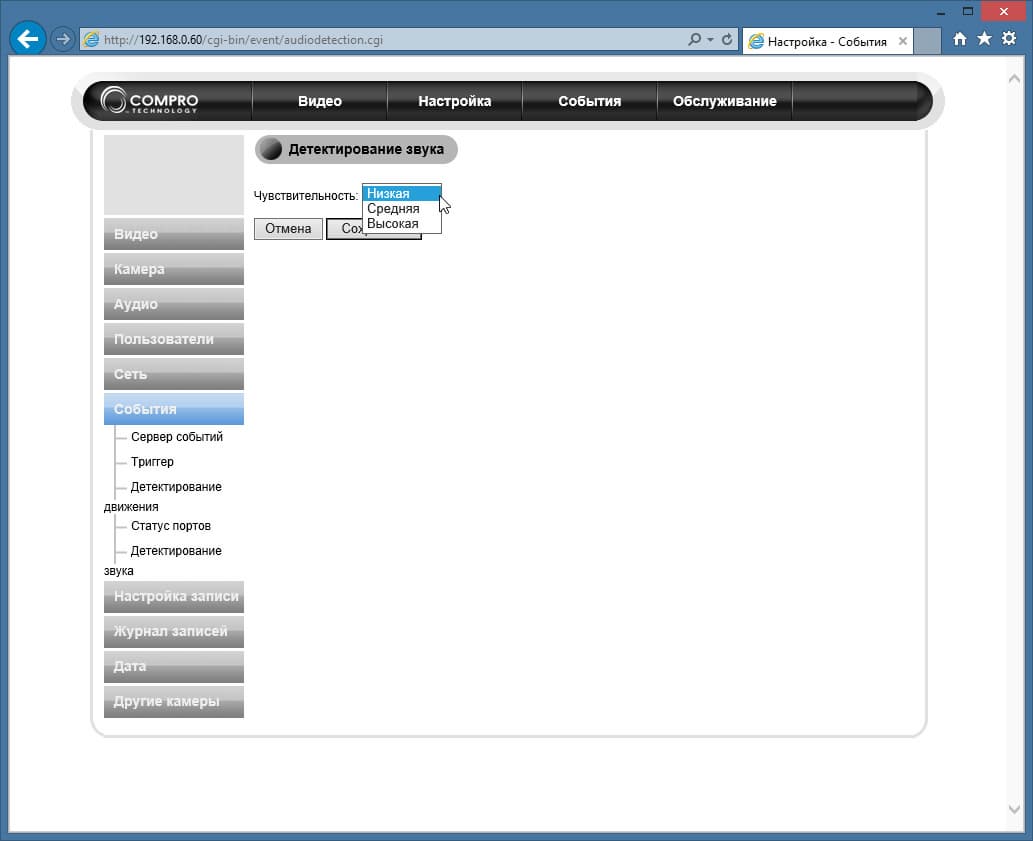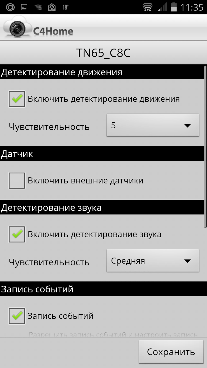 Эти настройки традиционно разбиты на множество подразделов, в которых изменяются параметры видеокадра, сетевого подключения, создаются серверы для будущей отправки оповещений о событиях или записи этих событий, настаиваются детекторы движения и звука, а также ведется анализ журнала событий с возможностью скачивания записанных на карту памяти роликов.