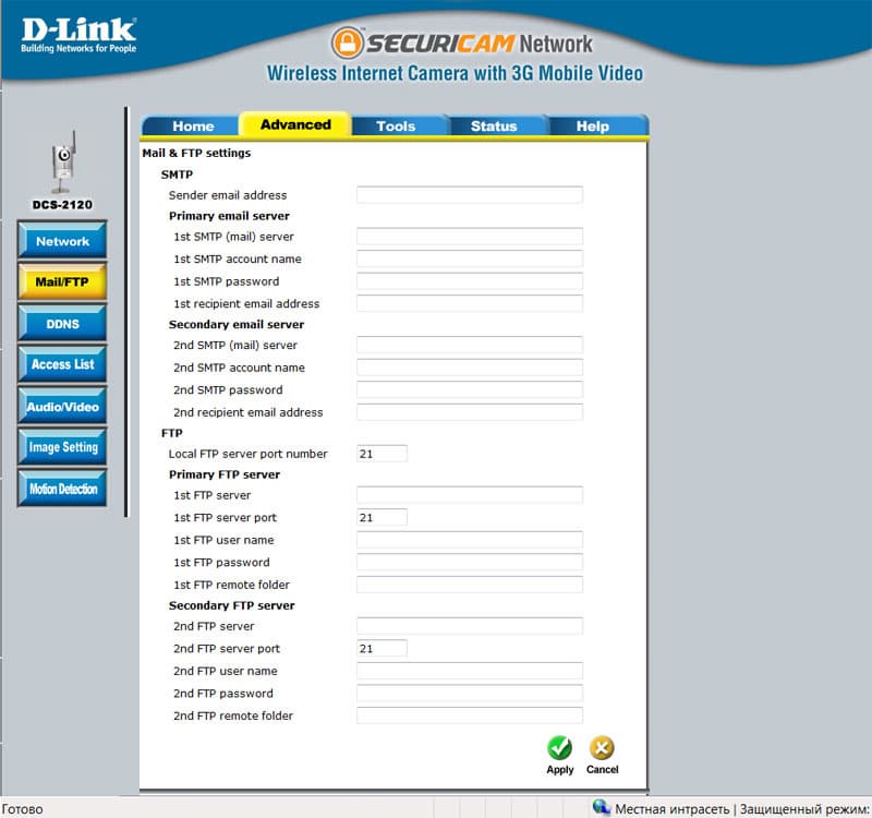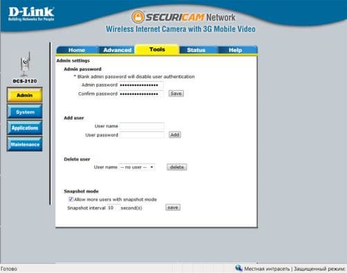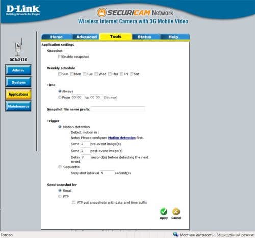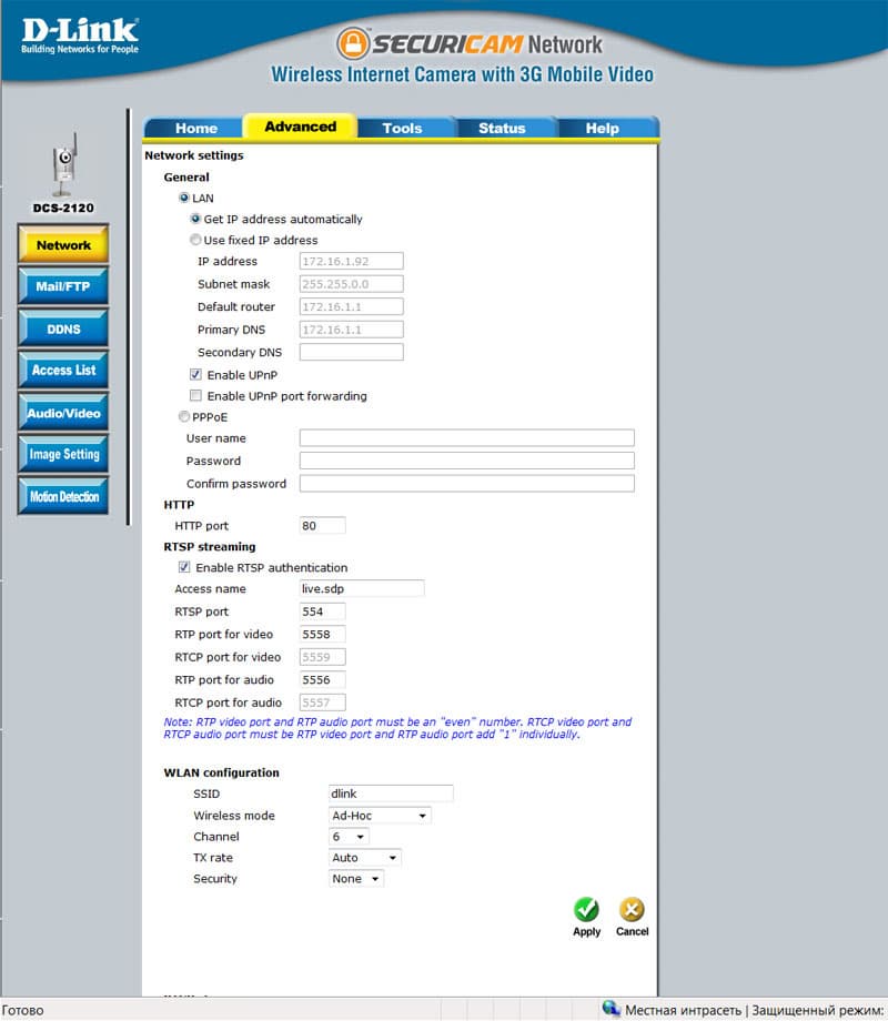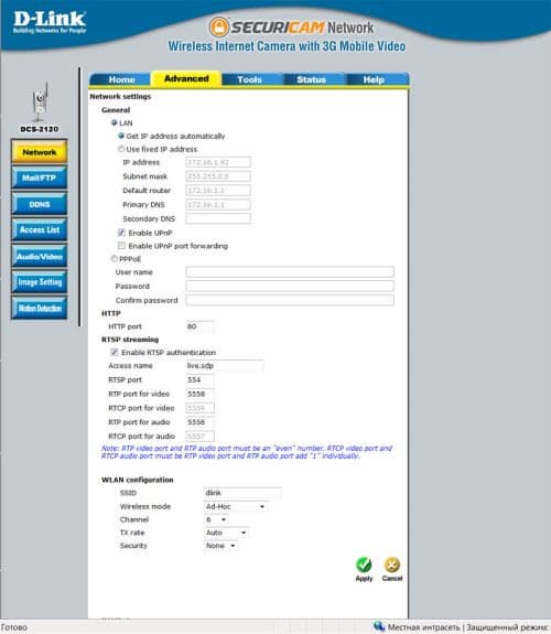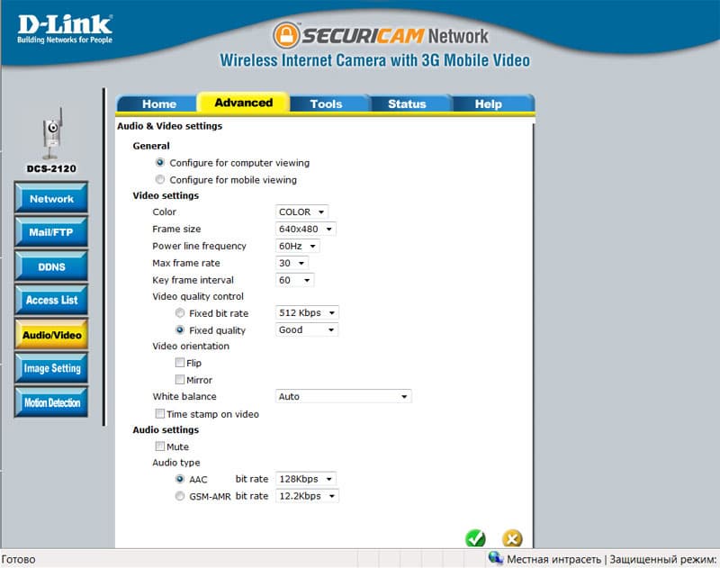 В самом начале статьи мы не зря упомянули 3G сотовую связь. Стандарт 3G характеризуется достаточно большой пропускной способностью канала связи, предоставляемого абоненту. А раз так, то почему бы и не использовать эту способность для передачи видео и звука в любую точку мира (конечно, где есть 3G)? Что и реализовано создателями DCS-2120. Более тонкая настройка характеристик передачи аудио- и видеопотоков производится с помощью пятой кнопки под названием «Audio/Video»: