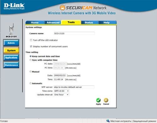 Второй – «System» – позволяет задать сетевое имя интернет-видеокамеры, а также настроить параметры синхронизации времени с удаленной машиной.