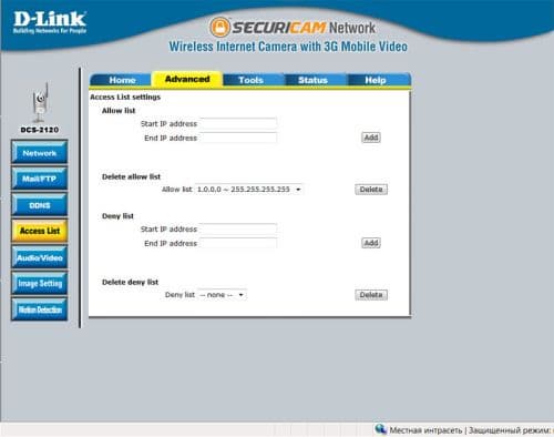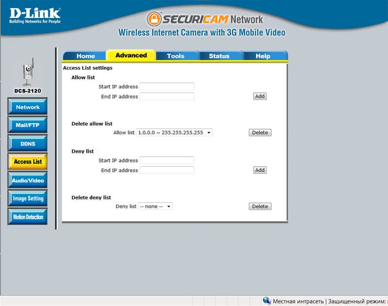 Четвертая кнопка, «Access List», позволит определить диапазоны IP-адресов, с которых можно подключаться к камере. Либо же наоборот, указать диапазоны, с которых нельзя производить такие подключения: