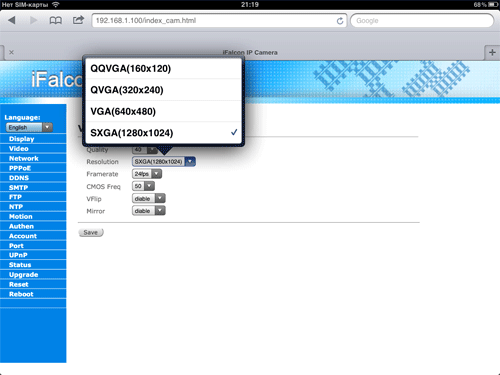 Подключившись, мы увидели на экране Apple iPad2 видеопоток в максимальном разрешении и в реальном времени (точнее, увидели ту его часть, что вместилась в границы экрана) и ради интереса заглянули в настройки видео, где и сделали вышеприведенный скриншот.
