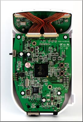 Отлично видна внутренняя компоновка камеры. Две платы соединяются с помощью двух групп проводов, причем возможно полное отсоединение этих плат друг от друга. Рассмотрим основную плату подробнее: