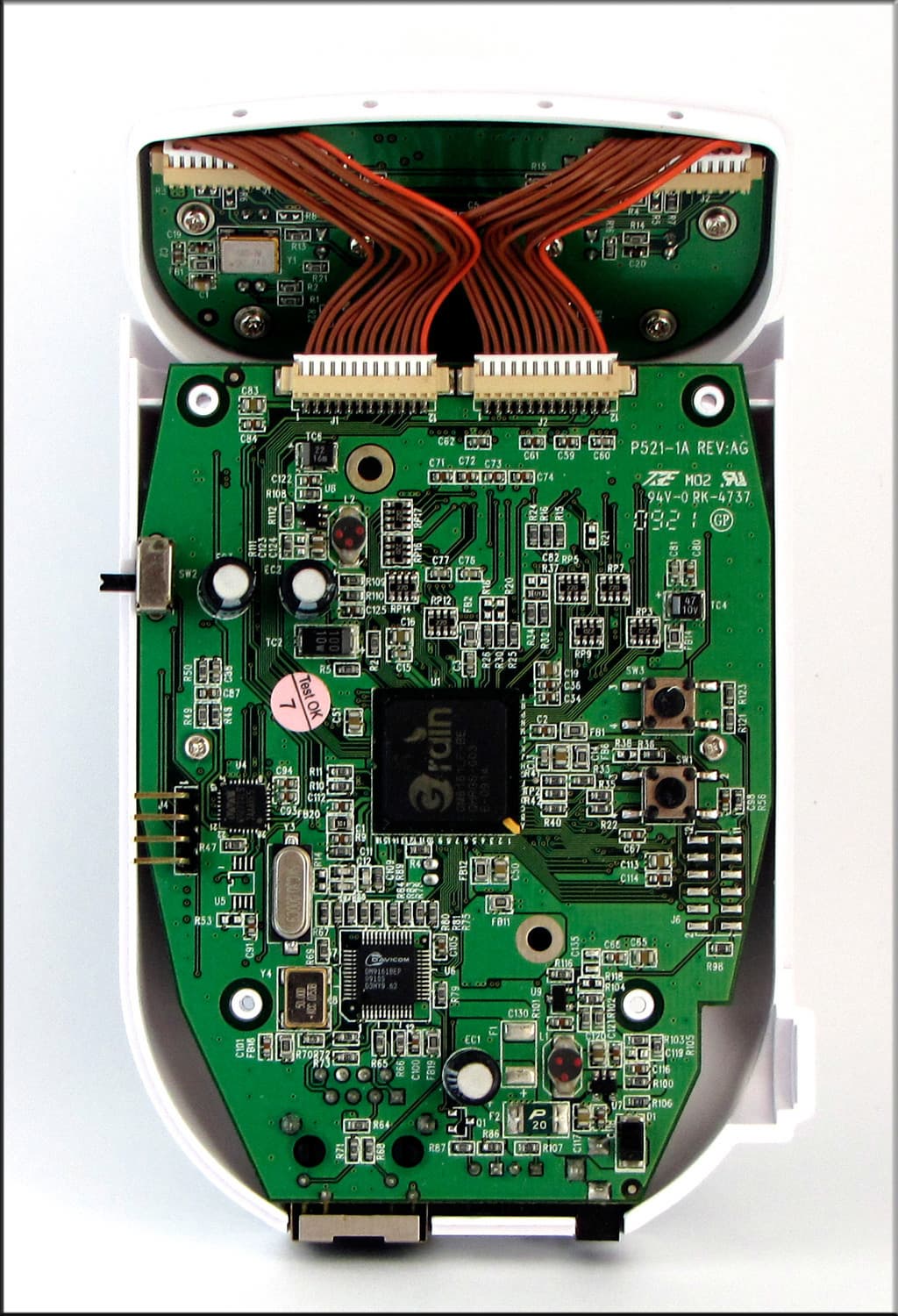 Самый большой чип на плате — это GM8161LF-BE. Так как нас до сих пор не забанили на google.com, спрашиваем там об этом чипе. Информации крайне мало, удается выяснить только то, что чип этот относится к семейству SoC (System-on-Chip), оснащен аппаратным кодеком H.264 и работает на частоте 333 МГц. Немного, но достаточно, чтобы предположить, что в качестве операционной системы в камере используется нечто линуксоподобное. Меньших размеров чип именуется DM9161BEP и представляет собой контроллер сетевого интерфейса. И самый маленький чип на этой стороне — WM 8731LS — это экономичный высококачественный аудиоконтроллер. Перевернем плату: