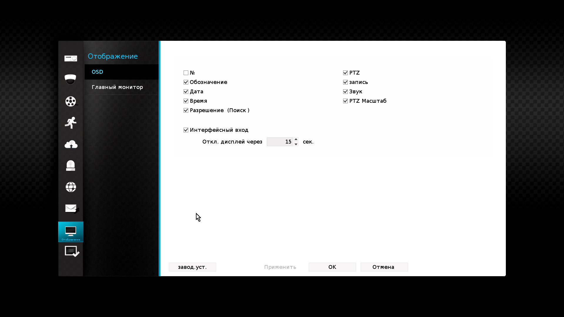 Раздел «Отображение» позволяет выбрать параметры и режимы локальных мониторов — представленную на OSD информацию, разрешение (требуется перезагрузка), режим смены изображений с камер.