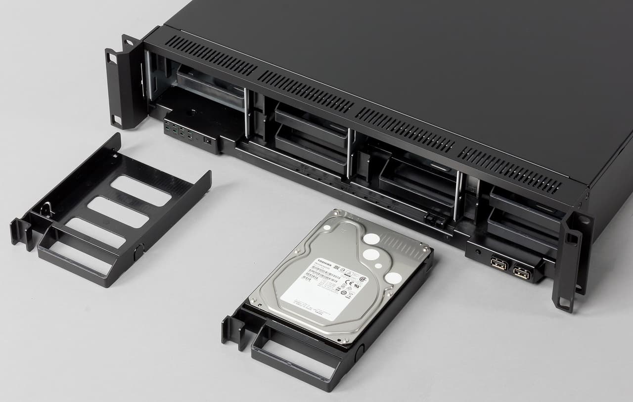 Внутри корпуса регистратора предусмотрено место для установки восьми жестких дисков SATA формата 3,5″ объемом до 8 ТБ каждый. Горячая замена для них не поддерживается. Дополнительно можно добавить на каждый из четырех портов eSATA фирменные модули, вмещающие до четырех накопителей по 8 ТБ. Таким образом, максимальный объем хранилища может достигать 192 ТБ. В случае использования отказоустойчивых конфигураций RAID 1/5/10, полезный объем будет меньше. В текущем списке совместимость представлено несколько моделей винчестеров от компании Toshiba.