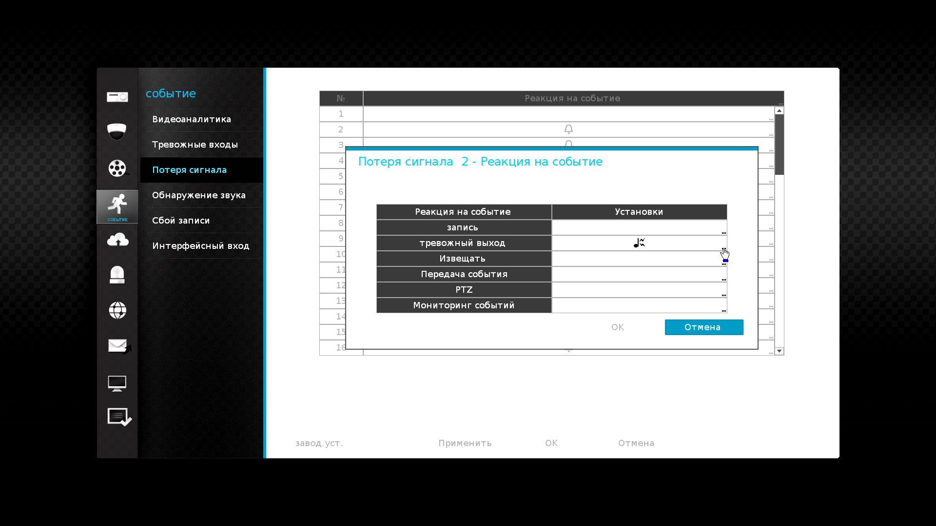 Для каждого события можно установить варианты реакции на него. В списке присутствуют такие возможности как включение записи с камеры, управление PTZ, активация тревожных выходов, звуковой сигнал, оправка уведомлений.