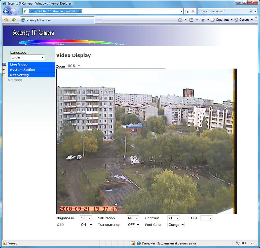 На этом экране присутствуют основные настройки изображения (с регулировкой в диапазоне 0 – 255 единиц), а также те настройки, с помощью которых можно вывести в кадр текущие дату и время. Кстати сказать, здесь же можно оценить и качество изображения, передаваемого обеими (Provideo FD-100P и Provideo VD-100P) IP-видеокамерами. В светлое время суток картинки практически идентичны, поэтому приводить два скриншота, в общем-то, нецелесообразно.