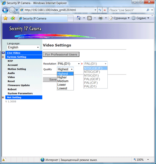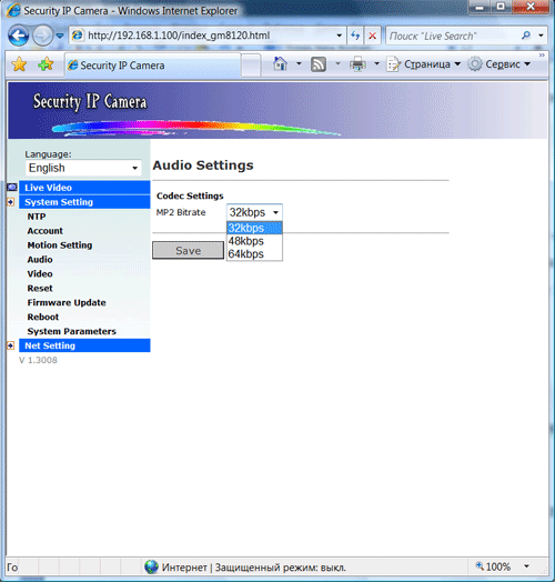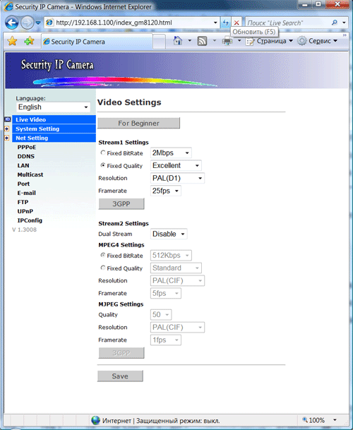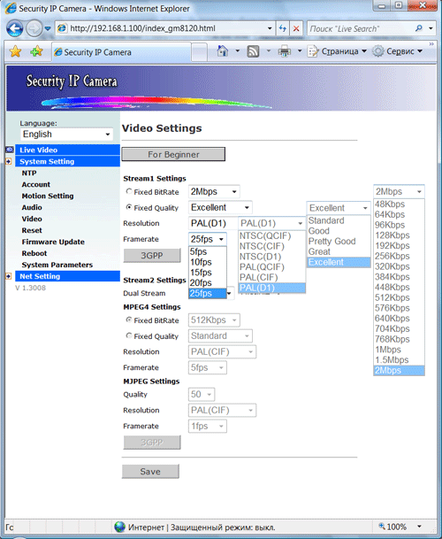 А вот в этом режиме настроек несколько побольше – можно прямо или косвенно определить битрейт видеопотока (Fixed BitRate – фиксированный битрейт, Fixed Quality – фиксированное качество), можно задать разрешение и формат цветового кодирования, а также можно указать так называемый «Framerate» - частоту кадров. Кроме этого, доступна кнопка «3GPP», по нажатию которой автоматически выставляются те значения настроек, которые помогут передать изображение посредством сетей сотовых операторов связи. Настройки под заголовком «Stream2 Settings» недоступны, но, судя по пунктам, они предусмотрены для настройки еще одного видеопотока (в нашем случае отсутствующего).