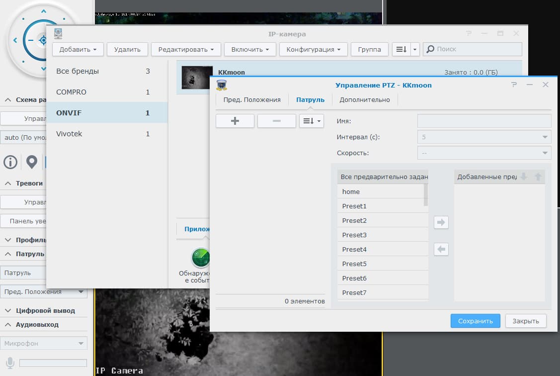 Приятнейшим открытием явилось то, что в настройках свежеподключенной через ONVIF камеры в пакете Synology появилась возможность, отсутствующая в штатном ПО камеры: режим патруля с точной скрупулезной подстройкой всех параметров.