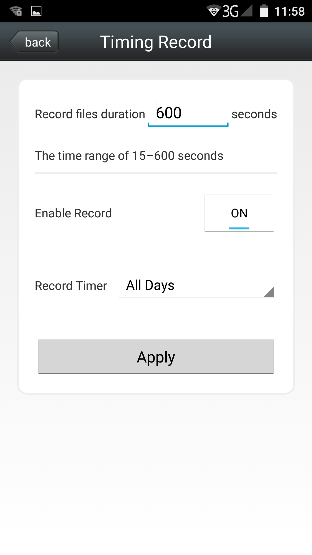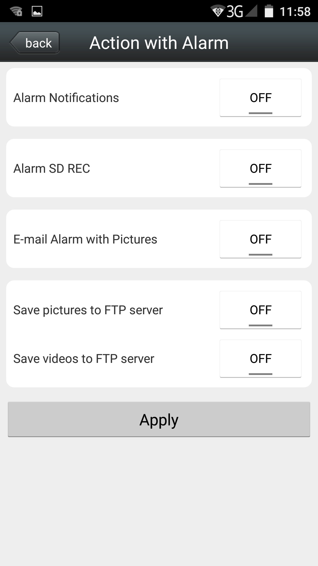 | Библиотека настроек | Настройки поведения по тревоге: отправка на смартфон Push-сообщений, запись на карту памяти, отсылка на E-Mail или FTP | Настройка длительности постоянной записи (режим записи по кругу) | |