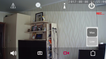 Но в этом интерфейсе мы не видим кнопок-стрелок, которыми можно было бы осуществлять вращение и наклон камеры. Все правильно. Они не нужны, так как движение по трем осям производится жестами. Стоит провести по дисплею смартфона влево — камера повернется влево. Проведешь вверх — соответственно, камера посмотрит вверх. Отзывчивость PTZ-двигателей камеры на жесты не всегда идеальна. Возможно, это зависит от качества связи, канала, по которому установлено соединение. Иногда камера словно бы «подтормаживает», раздумывая секунду-две, перед тем, как начать поворот или наклон платформы в указанном направлении. Но, в общем, такие недостатки совсем не критичны для бытового применения, а рассказ о них — это, скорее, привычные придирки слишком требовательного автора.
