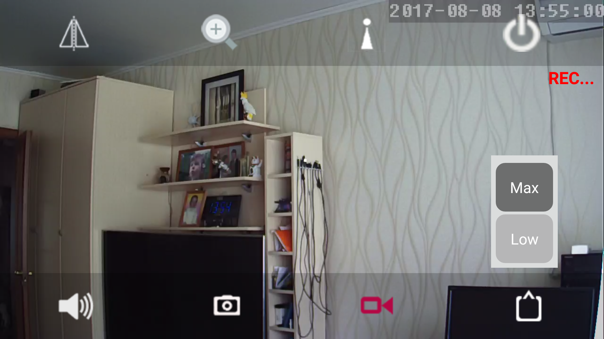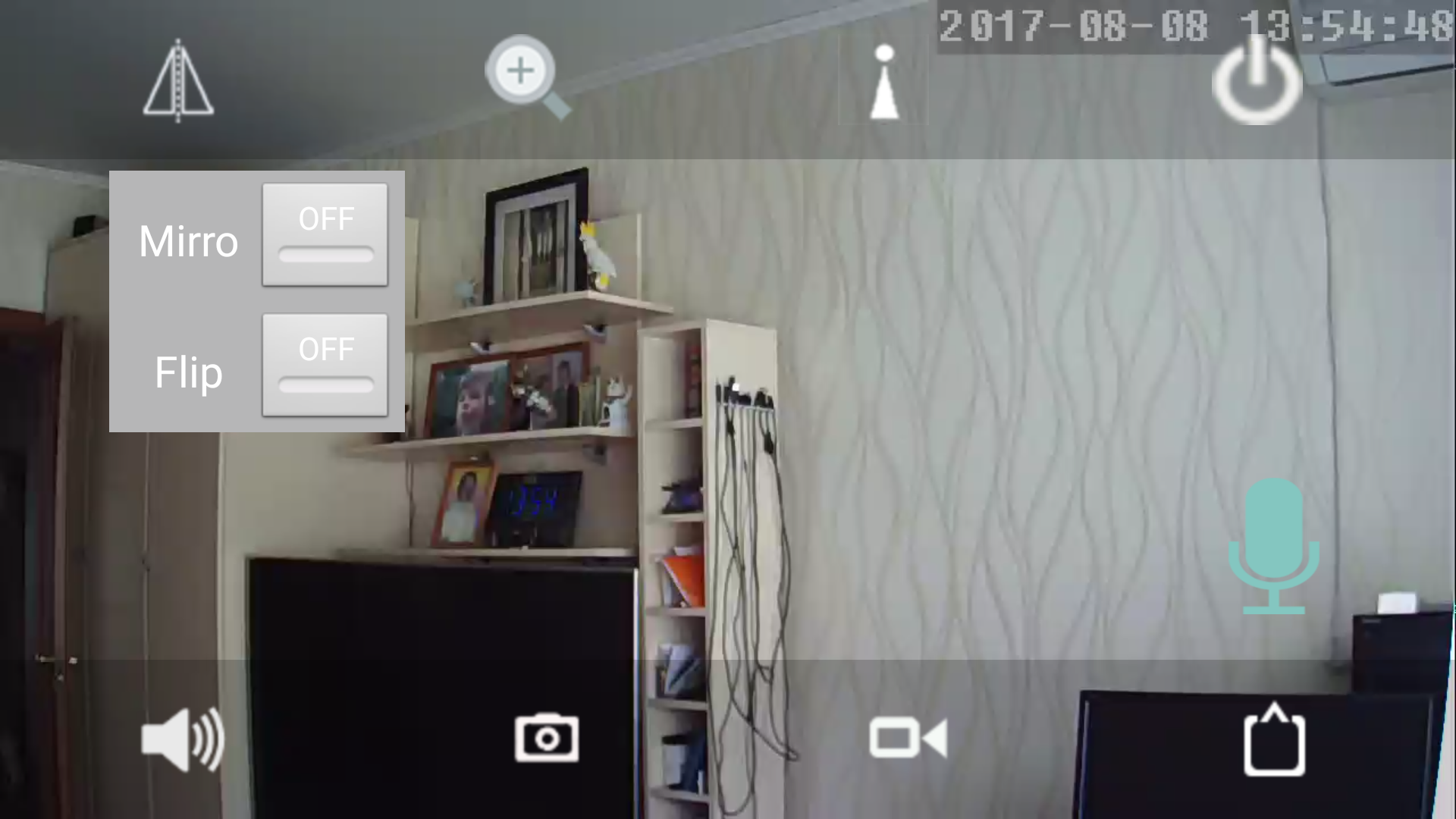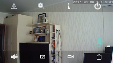 Режим наблюдения в мобильном приложении всегда работает в ландшафтной ориентации. Поверх передающегося с камеры видеопотока могут отображаться кнопки-пиктограммы, необходимые для вызова некоторых функций.