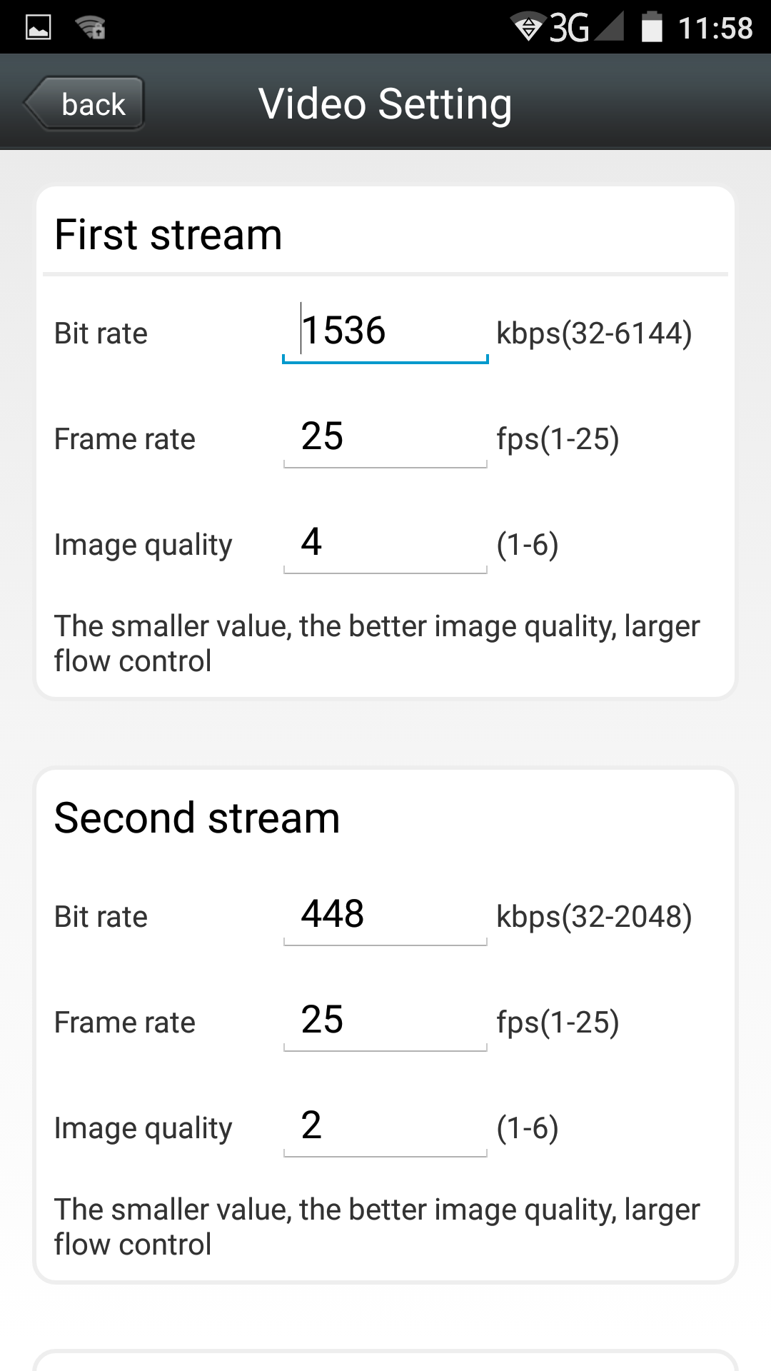 Как видим, из мобильного приложения позволяется регулировать даже параметры обоих видеопотоков, первого (основного) и второго (дополнительного для низкоскоростных соединений): битрейт и уровень качества кодирования.