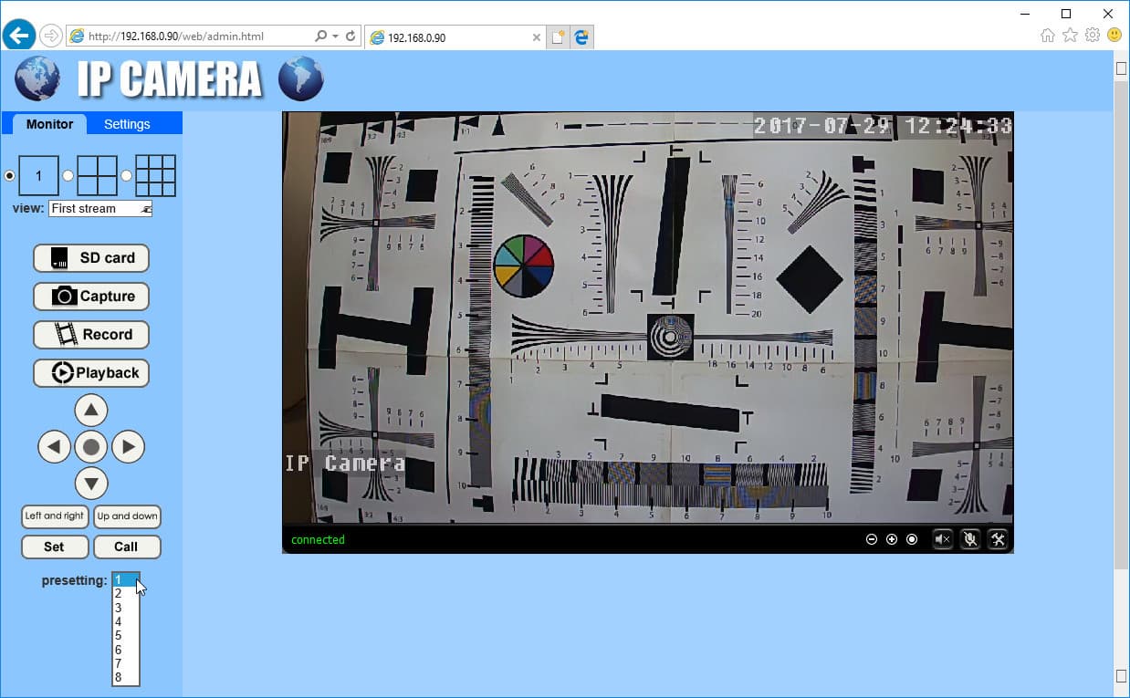 Скромный и довольно стандартный интерфейс главной веб-странички содержит в себе окно видеопотока с возможностью разделения на несколько частей для одновременного отображения множества камер. Здесь же, в боковой панели, находятся ссылки на странички с содержимым карты памяти и на модуль воспроизведения архива. Чуть ниже в форме джойстика расположены кнопки-стрелки для управления PTZ-механизмом камеры и список из восьми предустановок положения платформы. Кстати, если камера была повернута или наклонена вручную, без использования моторов (например, случайно задета), то восстановить калибровку можно с помощью кнопки, находящейся в центре джойстика. По ее нажатию будет приведен в действие механизм PTZ и камера произведет несколько тестовых наклонов и поворотов, этакую разминку, после чего вернется в центральное «умолчальное» положение.