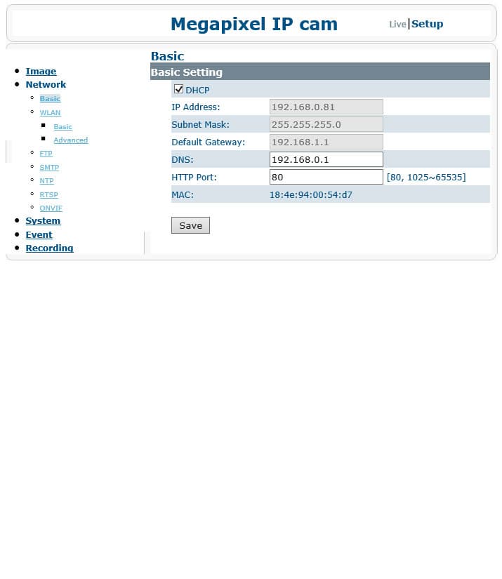 Питание данной камеры может осуществляться посредством сетевого адаптера и подаваться отдельно через имеющийся штекер. Но для уличной эксплуатации все же гораздо выгоднее использовать другую возможность — питание по локальной сети, PoE (Power over Ethernet).В этом случае питание к камере поступает по тому же кабелю — витой паре — что и данные. Правда, для этого потребуется специальный маршрутизатор или свитчер, который обеспечивает такую возможность. Данные устройства недешевы, но приобрести их нужно лишь единожды, зато теперь не требуется просверливать в стенах или оконных рамах две дырки — вполне достаточно одной, для витой пары.