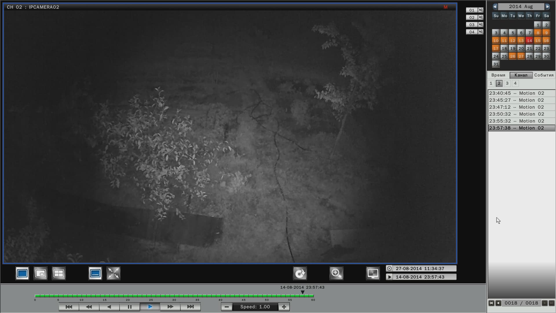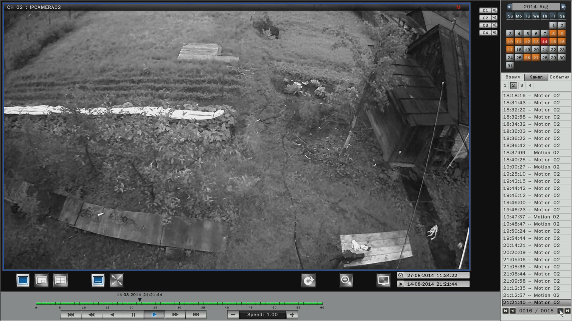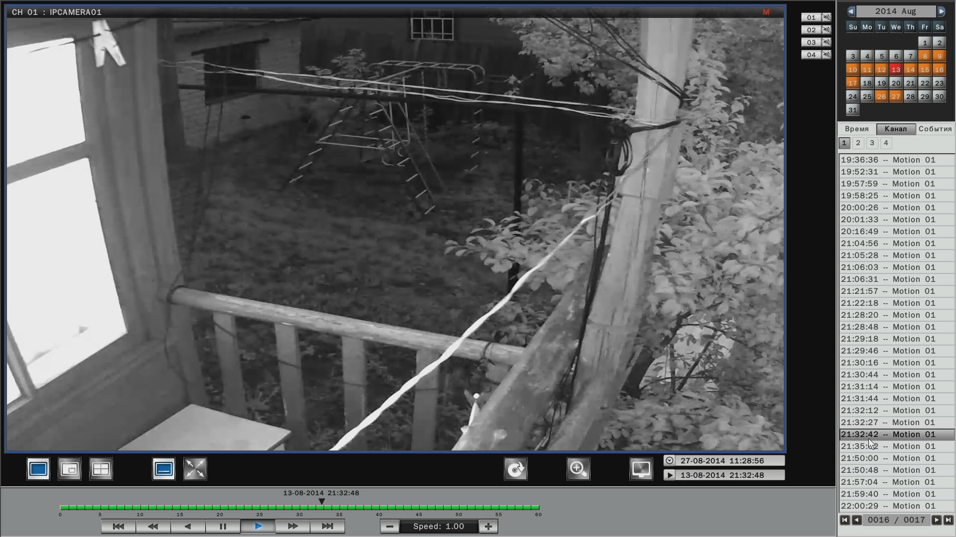 Просмотр архива ведется в специальном модуле, который вызывается нажатием кнопки, обозначенной характерной пиктограммой. В данном модуле имеется календарь, где дни, когда велся видеоархив, отмечены оранжевым цветом. Выбор нужного отрезка для просмотра производится либо перелистыванием списка и двойным щелчком по нужной строке, либо простым перетаскиванием ползунка по таймлинии в нужную временную отметку. Помимо такого «пассивного» просмотра, имеется возможность отфильтровать записи по типу событий: плановая запись, регистрация движения и т.д. По умолчанию в модуле просмотра представлен архив записей со всех камер (каналов). Но при желании некоторые камеры можно исключить из списка просмотра — надо лишь щелкнуть по кнопке с цифрой ненужного канала, деактивировав ее.