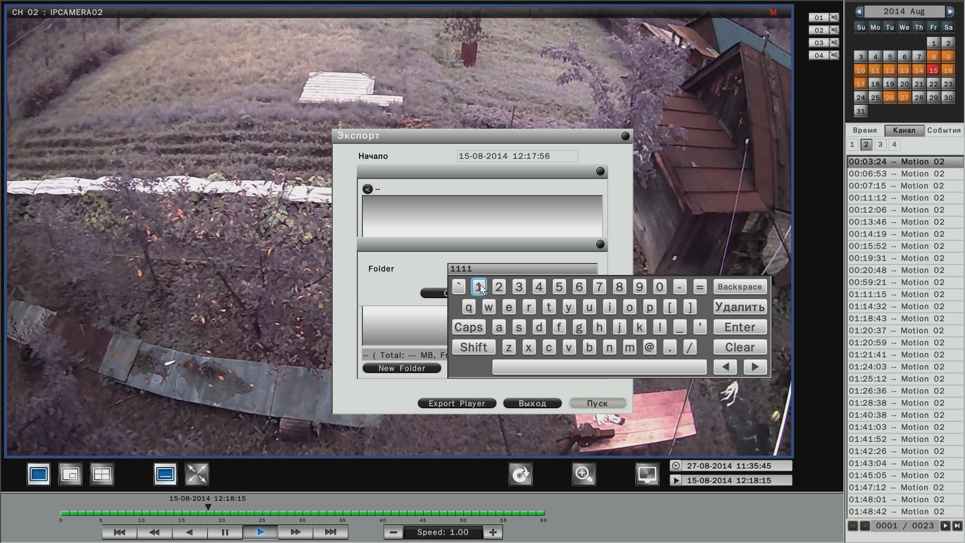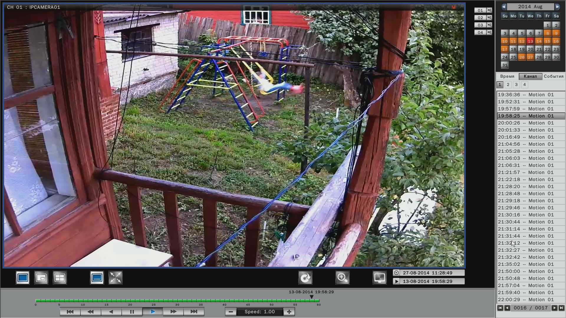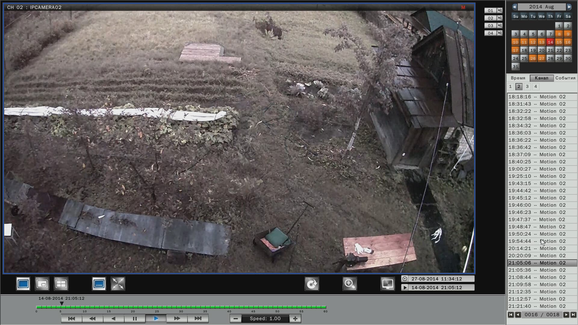 Просмотр архива ведется в специальном модуле, который вызывается нажатием кнопки, обозначенной характерной пиктограммой. В данном модуле имеется календарь, где дни, когда велся видеоархив, отмечены оранжевым цветом. Выбор нужного отрезка для просмотра производится либо перелистыванием списка и двойным щелчком по нужной строке, либо простым перетаскиванием ползунка по таймлинии в нужную временную отметку. Помимо такого «пассивного» просмотра, имеется возможность отфильтровать записи по типу событий: плановая запись, регистрация движения и т.д. По умолчанию в модуле просмотра представлен архив записей со всех камер (каналов). Но при желании некоторые камеры можно исключить из списка просмотра — надо лишь щелкнуть по кнопке с цифрой ненужного канала, деактивировав ее.