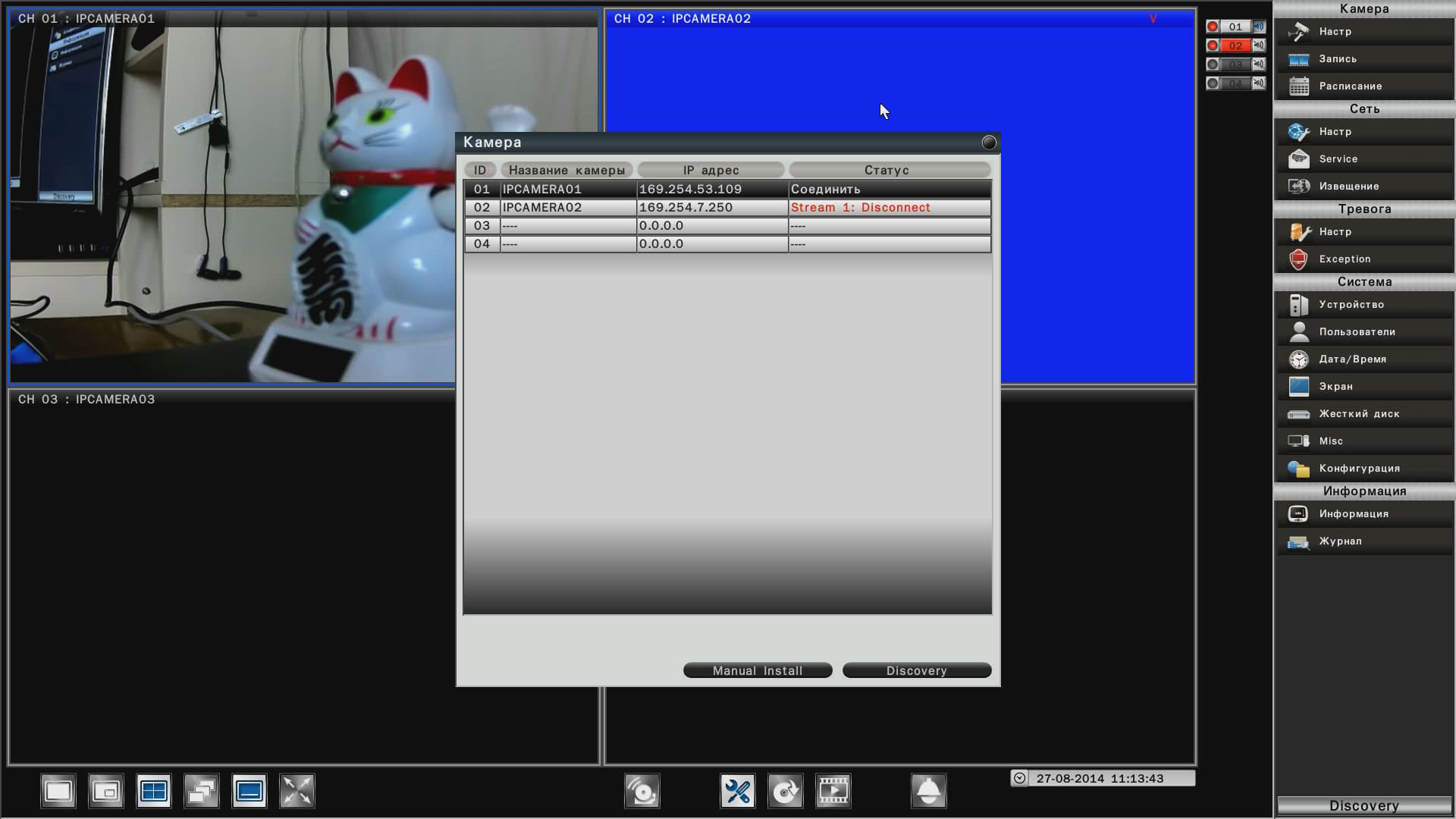 В таком режиме регистратор сканирует локальную сеть в поисках поддерживаемых камер, включенных в нее, и присваивает каждой подошедшей камере адрес. Если ранее какие-то камеры уже подключались, но в настоящий момент оказались отключены — упоминание о них также появляется в списке найденного оборудования, однако в графе Статус вместо «Соединено» имеется выполненная красным цветом предостерегающая надпись: Disconnect.