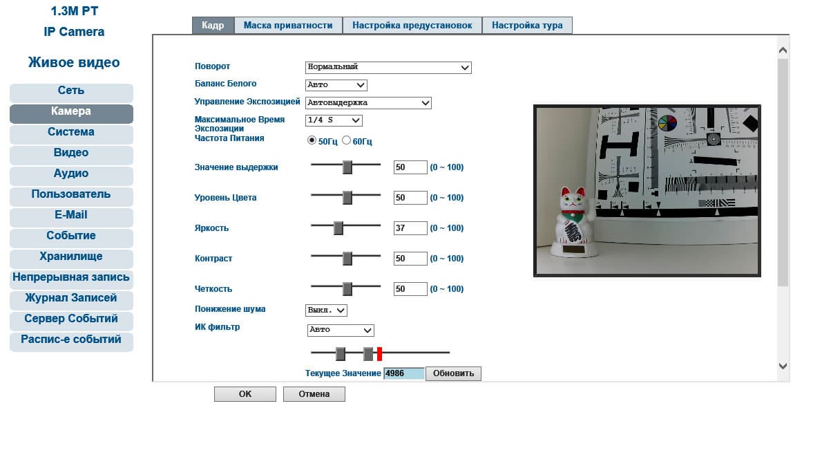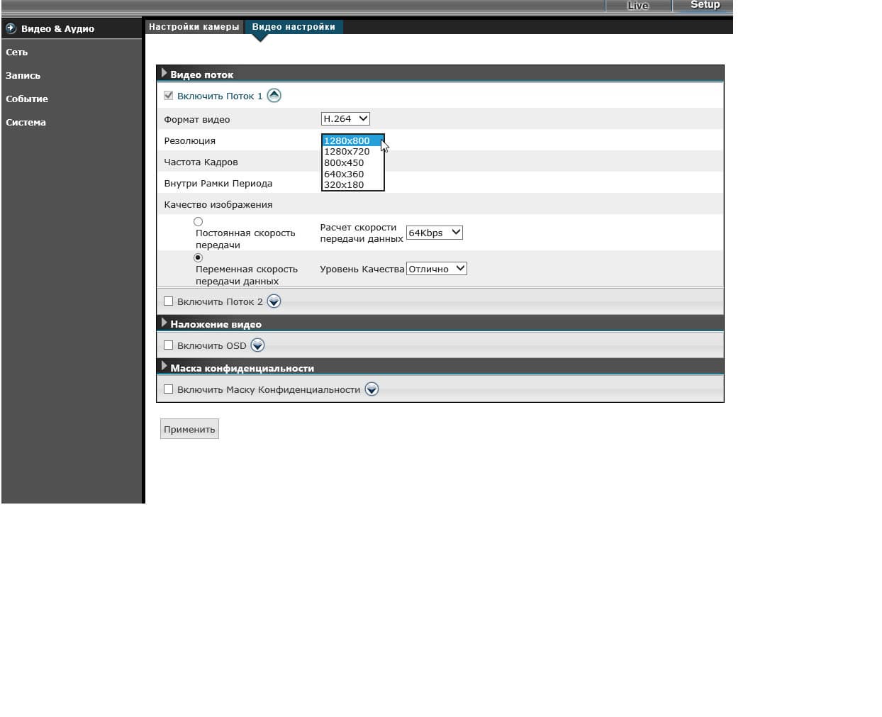 | Настройки рассматриваемой камеры имеют широкий выбор параметров, отвечающих за картинку: доступно детальное управление параметрами экспозиции, выбор способа переключения в ночной ИК-режим, агрессивность усиления. Разрешение (точнее, размер кадра) варьируется от 1280×800 до 320×180, кодирование потока возможно как с постоянным, так и переменным битрейтом. При трансляции камера способна добавить поверх видео информацию, содержащую имя камеры, текущие дату и время. | |
