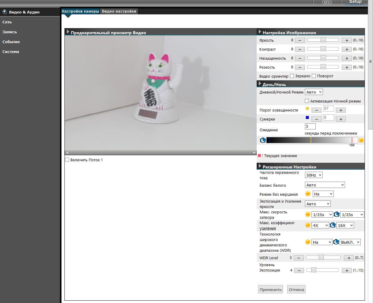 | Ключевые параметры в разделе настроек видео — выдержка, четкость и понижение шума (шумоподавление). Следует отметить гибкие настройки автоматического перехода в ночной режим и обратно. Параметры сети включают в себя поддержку большого количества протоколов, включая также PPPoE, что позволяет использовать камеру без компьютера даже при наличии только коммутируемого соединения с Интернет. Из поддерживаемых DDNS сервисов здесь только два — dyndns.com и no-ip.com. | |