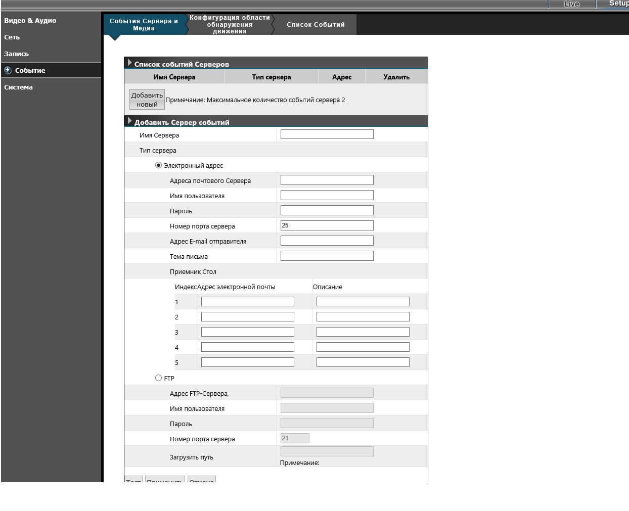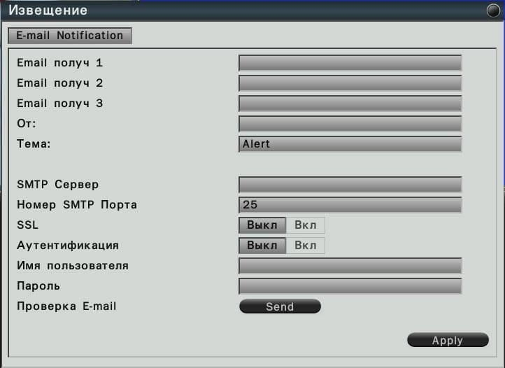 Но грош цена была бы всем этим детекторам движения, датчикам и тревожным входам, если бы регистратор не умел каким-то образом информировать пользователя о том или ином произошедшем событии. Для локального оповещения в корпусе регистратора имеется довольно громкий истошно визжащий зуммер, который разбудит любого охранника, любящего вздремнуть на дежурстве. Удаленное же оповещение организовано посредством отсылки сообщения по электронной почте (сразу на три разных адреса), либо через SMTP.