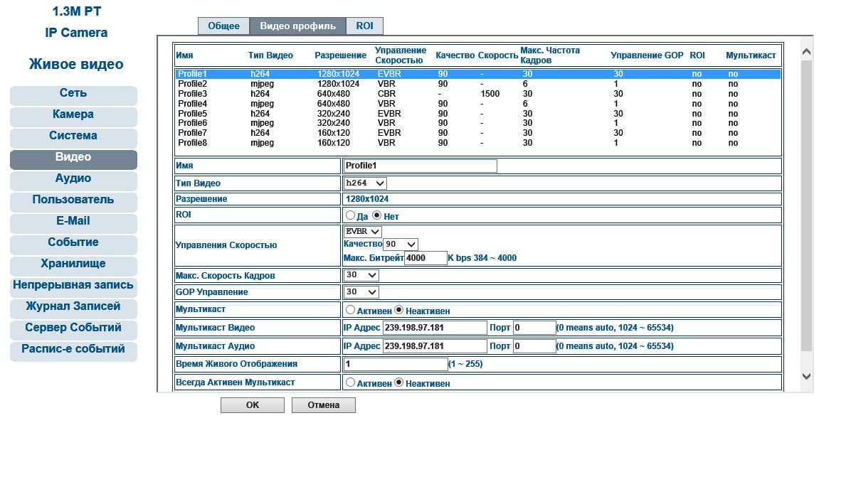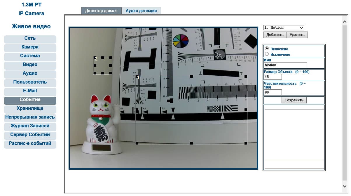 | В камере имеются предустановленные профили трансляции видеопотока, максимальный размер кадра составляет 1280×1024, минимальный — 160×120. Настройка детектора движения включает возможность установления зон реагирования; каждая такая зона может иметь собственные настройки чувствительности. | |