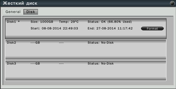 Наконец, взглянем на модуль управления жесткими дисками. Регистратор позволяется оснастить сразу тремя HDD, что видно на следующем скриншоте. Информация о дисках включает в себя их размер, текущую температуру, процент заполненности, и даже время и дату начала записи на данный диск. Поскольку в нашем случае при тестировании мы ограничились одним носителем, то вместо отсутствующих дисков видим пустые строчки.