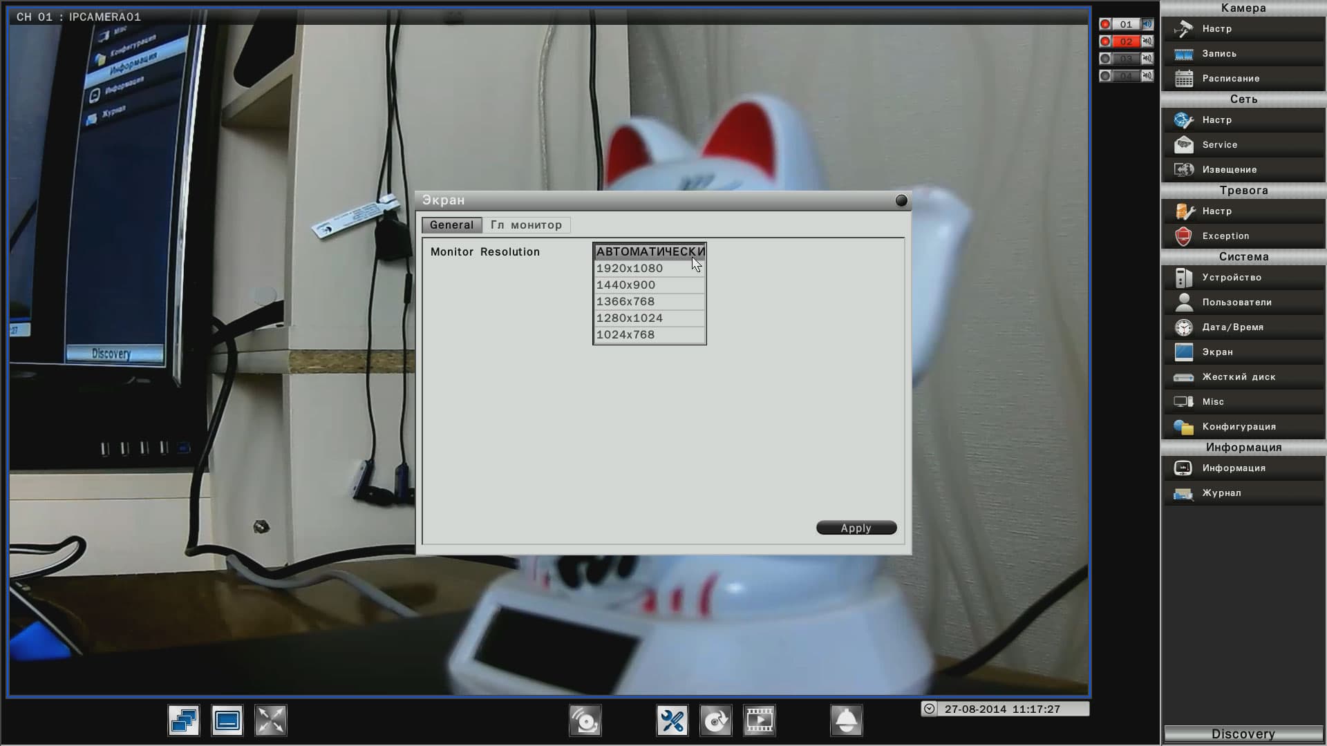 Благодаря наличию двух видеовыходов (RGB и HDMI) к регистратору можно подключить два Full HD телевизора или монитора. Разрешение каждого из них может быть разным, настройки видеовыходов содержат следующие списки: