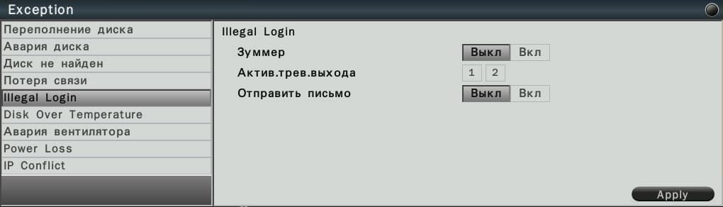 Помимо регистрации движения, аппарат может фиксировать множество прочих событий. Среди них присутствуют такие, как переполнение диска (дисков), неудачная попытка входа в управляющий интерфейс, и даже неисправность вентилятора.