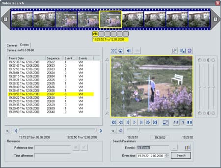 Слежение слежением, но как же здесь организован поиск записанных камерой событий? Этим ведает специальный модуль, вызываемый из программы MXControlCenter. Здесь лучше всего подойдет избитая фраза "интуитивно понятный интерфейс". И в самом деле вкладки, кнопки, список камер и событий достаточно наглядны и не требуют отдельных пояснений. Следует лишь учесть, что для поиска лучше использовать компьютер помощнее, который в состоянии будет обработать то количество свалившейся в его память информации. Не забываем: каждый кадр это серьезный мегапиксельный объект!
