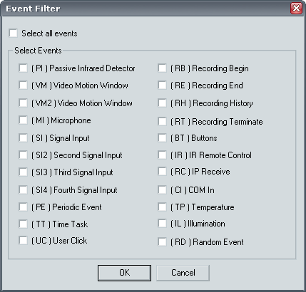Поиск событий можно вести не только лишь по моментам срабатывания датчика движения. Судите сами: на рисунке ниже можно видеть список событий, на которые камера может реагировать тем или иным образом (что целиком и полностью зависит от владельца аппарата).