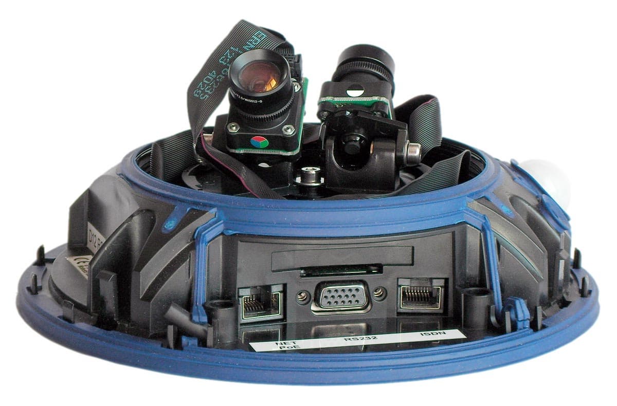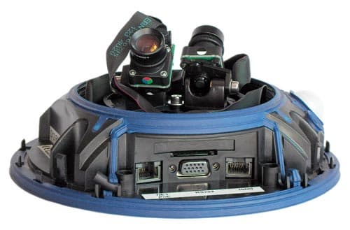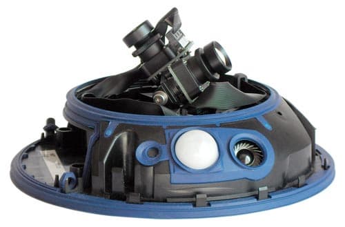Типичное НЛО, ни дать ни взять, только вверх тормашками. Правильно, ведь камера-то потолочного типа, и должна крепиться именно так. Кожух аппарата изготовлен из все того же ударопрочного пластика с мелкими вкраплениями серого цвета. В комплекте с камерой находится дополнительный защитный колпак, слегка затемненный он пригодится, если камеру необходимо установить в ярко освещенном месте. Полное отсутствие выступающих частей, в которых так любит селиться пыль, копоть и грязь. Явный намек на долговременную автономную работу аппарата.