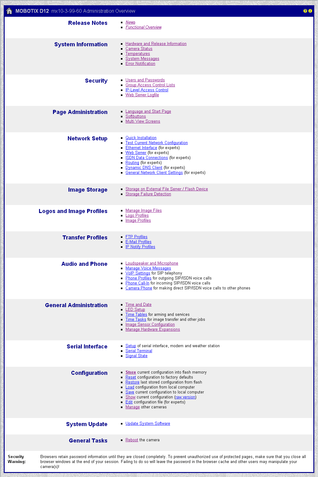 Вот так выглядит страничка "приветствия" администратора. Здесь собраны те настройки, изменить которые вправе лишь администратор, ответственный за внутреннее содержание камеры. Такие основные параметры, как место хранения видеоархива и других событий или обновление внутреннего программного обеспечения разумеется, все это может быть только администраторской привилегией.