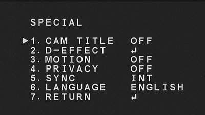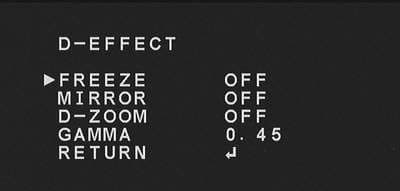 Действительно, подобрать другое название этому пункту меню затруднительно. Здесь собраны такие настройки, как «Cam Title» (имя камеры), «D-Effect» (эффекты постобработки — зеркалирование, заморозка, увеличение и исправление гаммы):